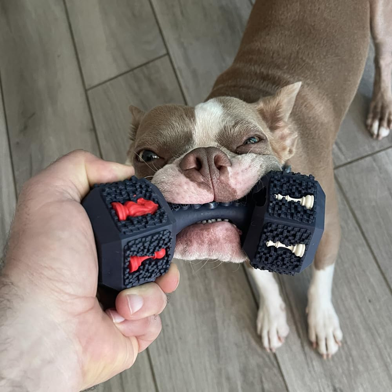 Besides having a dumbbell shape, it also offers extra benefits thanks to its 3D particles, which can help stimulate chewing, reduce tartar buildup, and improve breath.