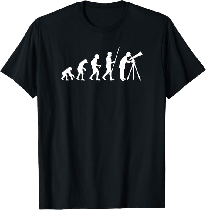 This is another great t-shirt for astronomy fans. It represents the evolution of humans, from primitive ancestors to modern humans capable of using tools like telescopes to observe the cosmos.